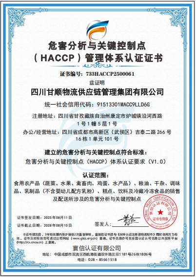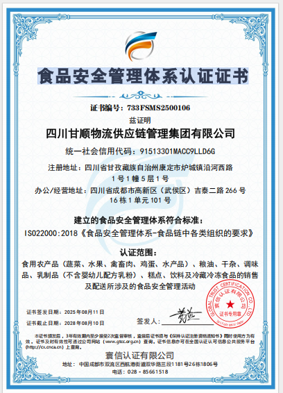管理体系成果丰硕。为强化业务运营、风险管控和管理合规,甘顺供应链公司不断提升自身实力,通过一系列有效措施,制定并完善公司管理体系,8月11日取得了寰信认证有限公司颁发的《质量管理体系认证证书》《环境管理体系认证证书》《食品安全管理体系认证证书》和《危害分析与关键控制点(HACCP)管理体系认证证书》和《职业健康安全管理体系认证证书》5个管理体系认证证书,标志着甘顺供应链公司取得企业合规运营的“通行证”,更是甘顺供应链公司从质量、环境、安全、健康多维度构建供应链业务可持续发展能力的战略工具。