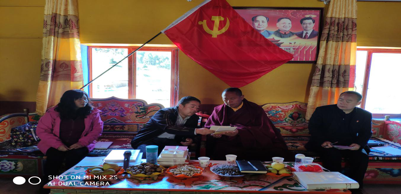 在党总支书记易刚的带领下,全体党员、预备党员、入党积极分子实地查看了寺庙基础设施的建设情况,详细了解僧尼的日常生活情况,并向寺庙僧尼赠送了面粉、清油等慰问品2000余元。同时,党总支书记易刚向僧尼们宣讲了习近平总书记关于民族宗教相关讲话精神及《宗教事务条例》和《甘孜州民族团结进步条例》,并赠送了《习近平新时代中国特色社会主义思想学习纲要》藏汉版、《弘扬爱国奋斗精神、建工立业新时代》《中华人民共和国宪法》等书籍,希望寺庙僧尼要爱国爱教,要坚定拥护党的领导和政府决策,坚定维护祖国统一和民族团结,坚定维护社会和谐稳定,积极响应党委、政府的号召,规范佛事活动,依法开展宗教活动,加强和创新寺庙管理工作,积极引导宗教与社会主义相适应,依法加强宗教事务管理。